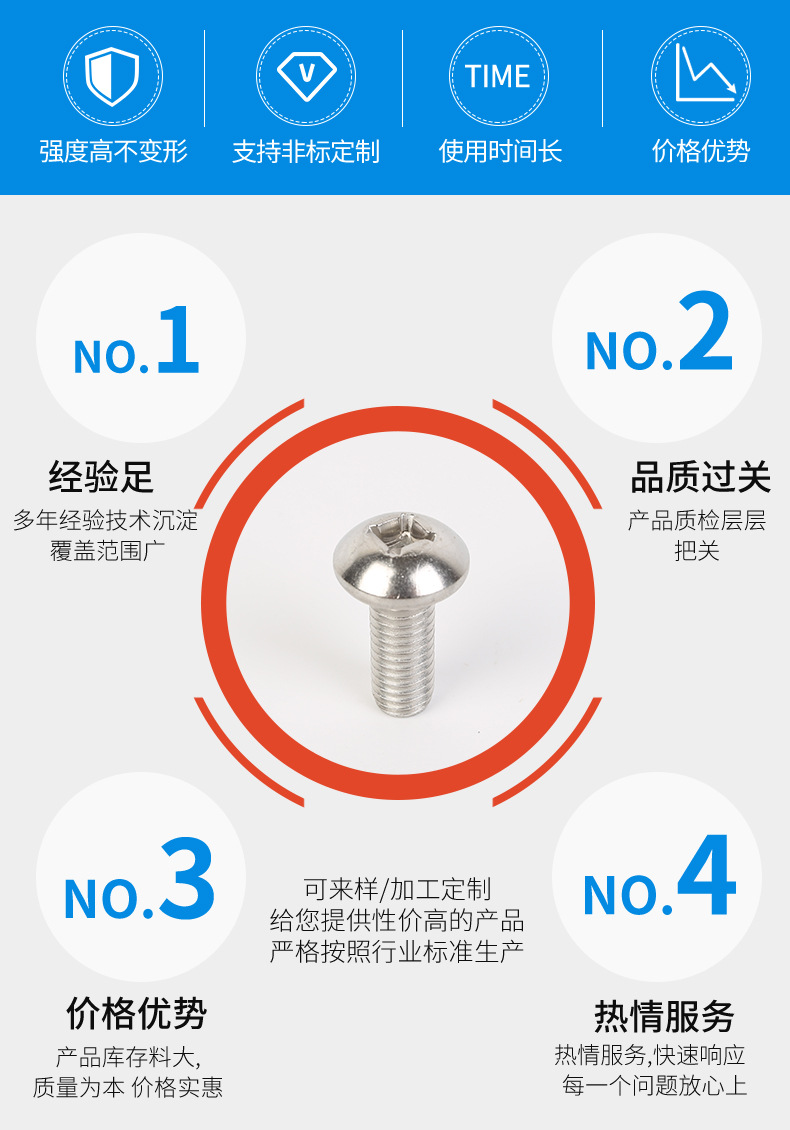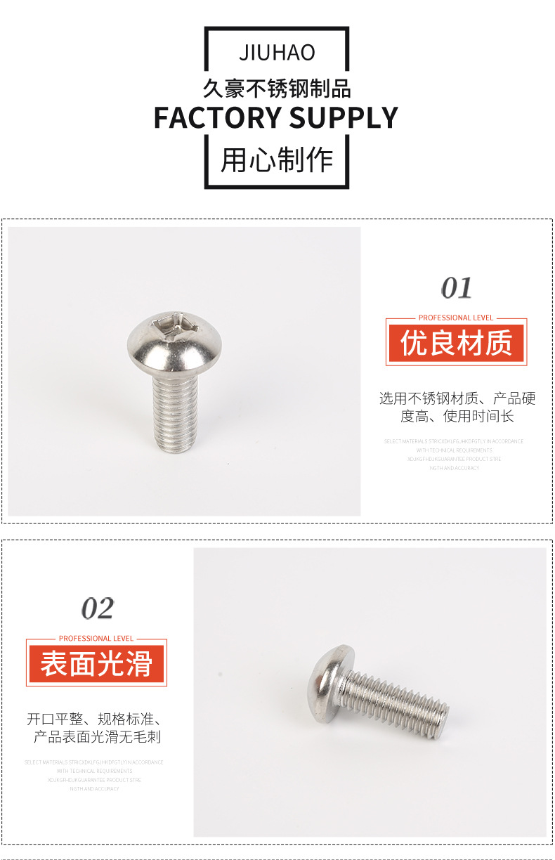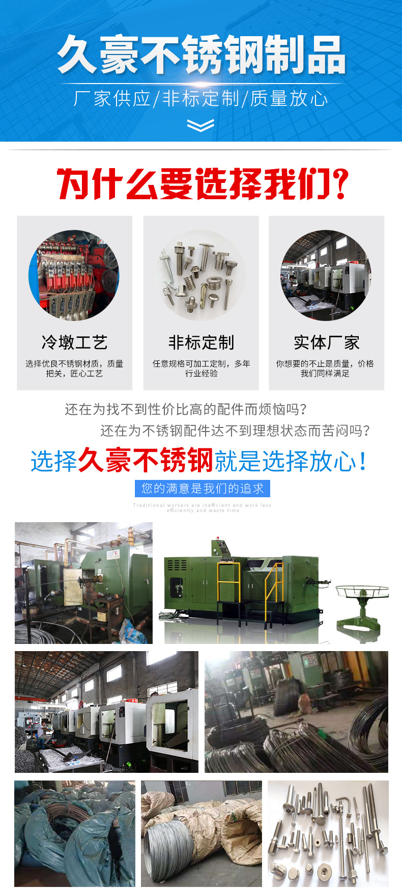 兴化市久豪不锈钢制品有限公司专业非标件开发加工,主营304、316等材料及一些特殊材料的轴肩螺丝,t型螺丝,台阶螺丝、防盗螺丝、马车螺丝、空心铆钉等,公司拥有完整、科学的质量管理体系。