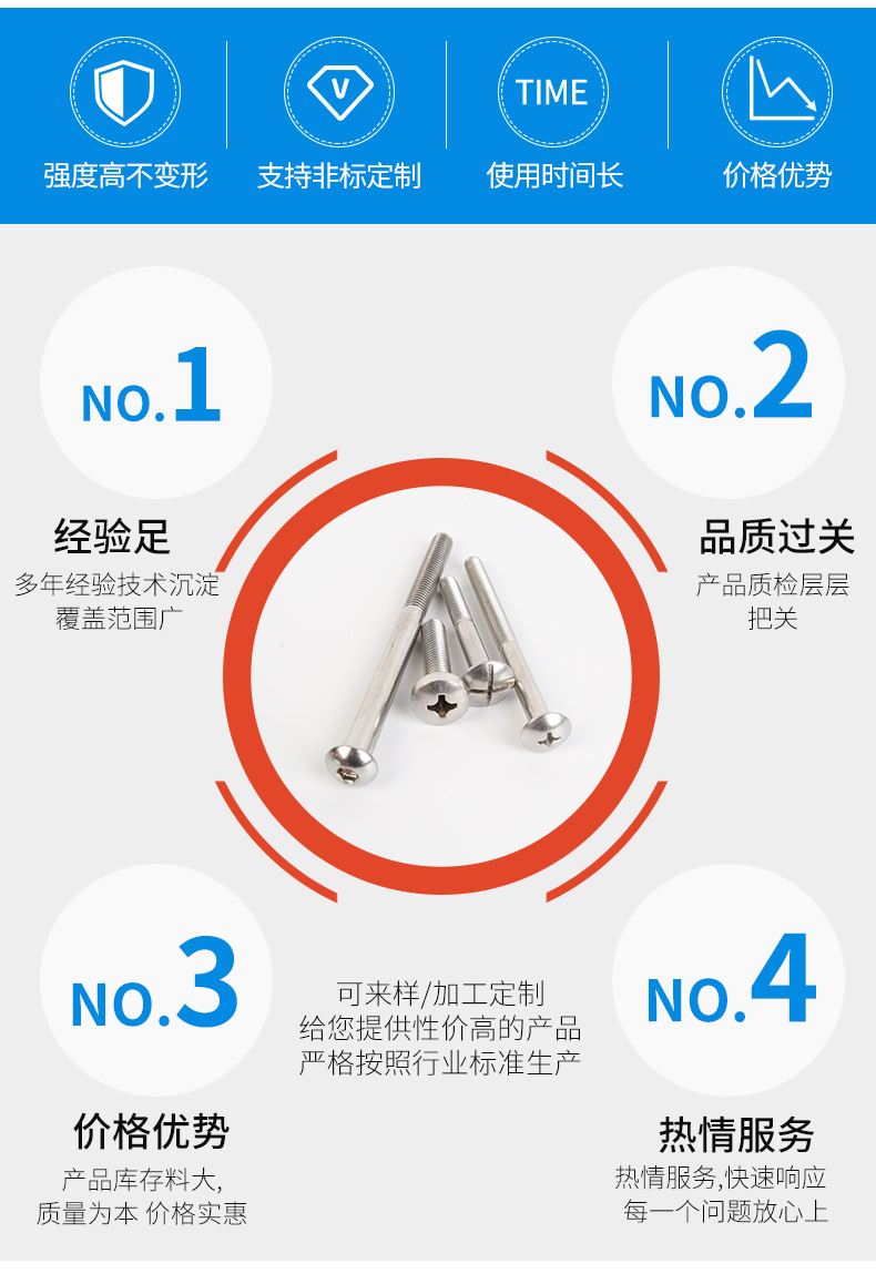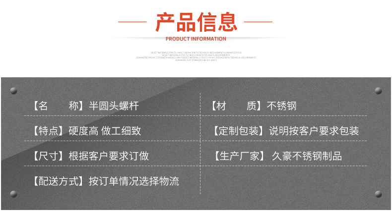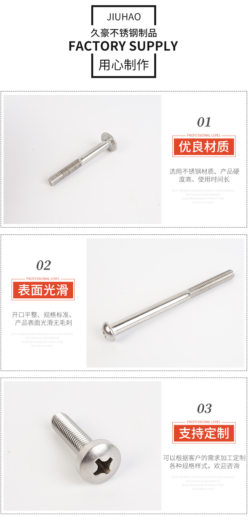 兴化市久豪不锈钢制品有限公司专业非标件开发加工,主营304、316等材料及一些特殊材料的轴肩螺丝,t型螺丝,台阶螺丝、防盗螺丝、马车螺丝、空心铆钉等,公司拥有完整、科学的质量管理体系。