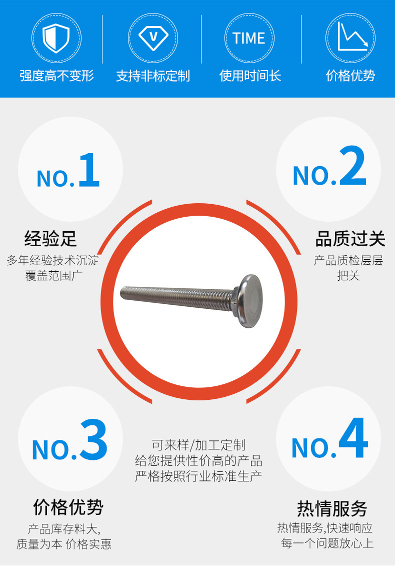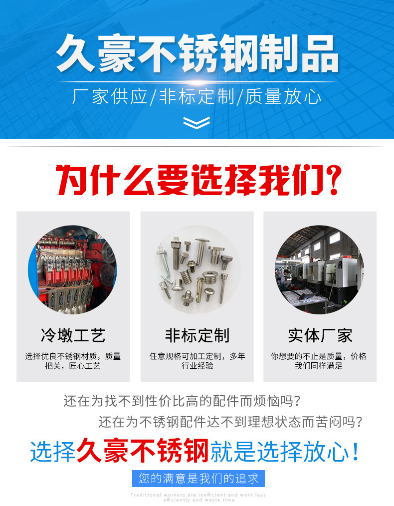 兴化市久豪不锈钢制品有限公司专业非标件开发加工,主营304、316等材料及一些特殊材料的轴肩螺丝,t型螺丝,台阶螺丝、防盗螺丝、马车螺丝、空心铆钉等,公司拥有完整、科学的质量管理体系。
