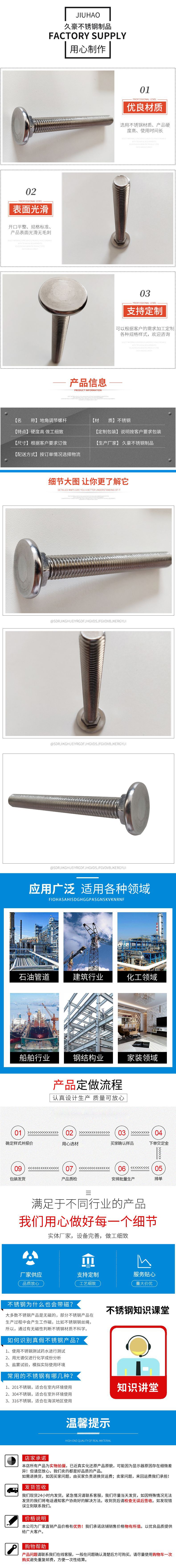 产品介绍:兴化市久豪不锈钢制品有限公司专业非标件开发加工,主营304、316等材料及一些特殊材料的轴肩螺丝,t型螺丝,台阶螺丝、防盗螺丝、马车螺丝、空心铆钉等...